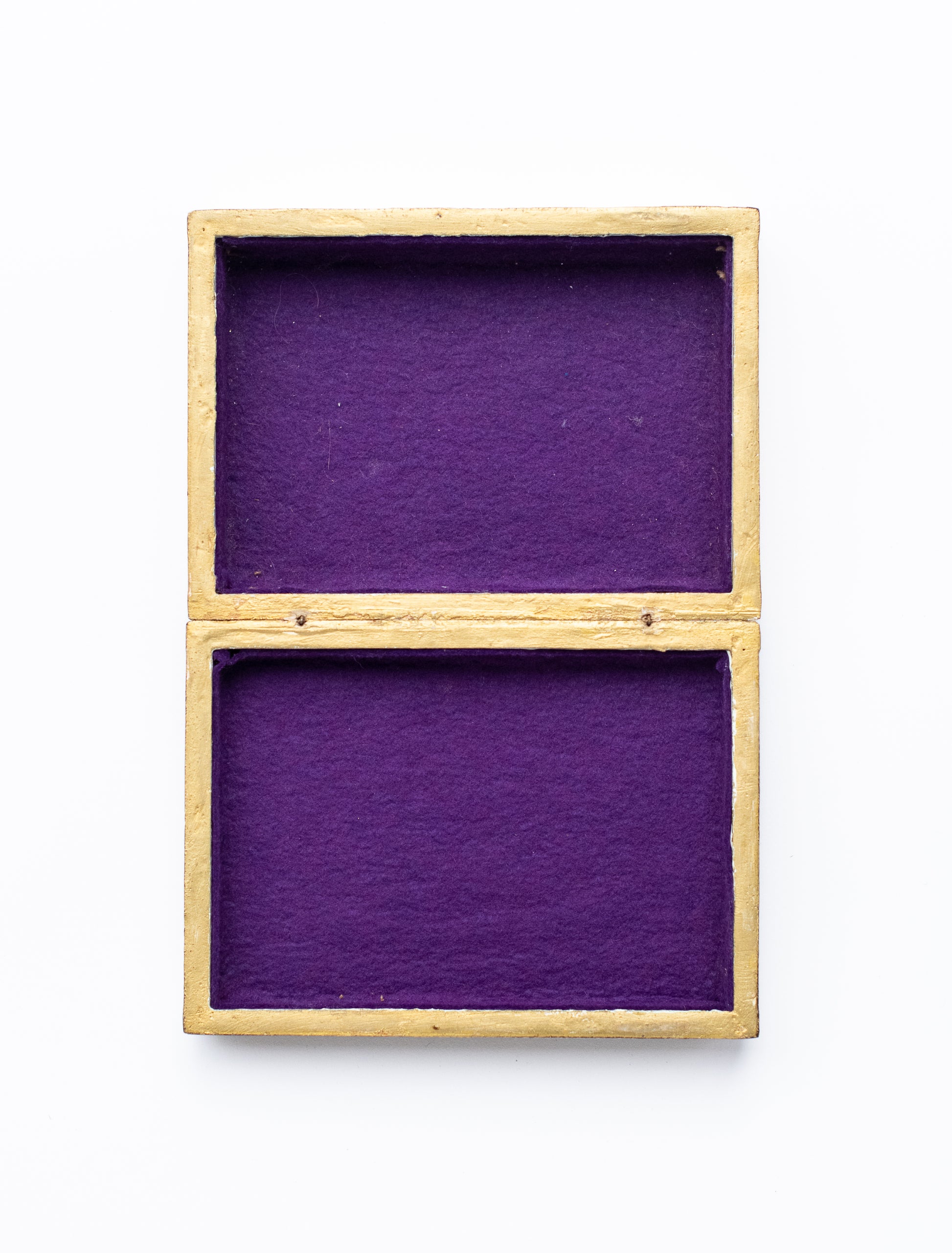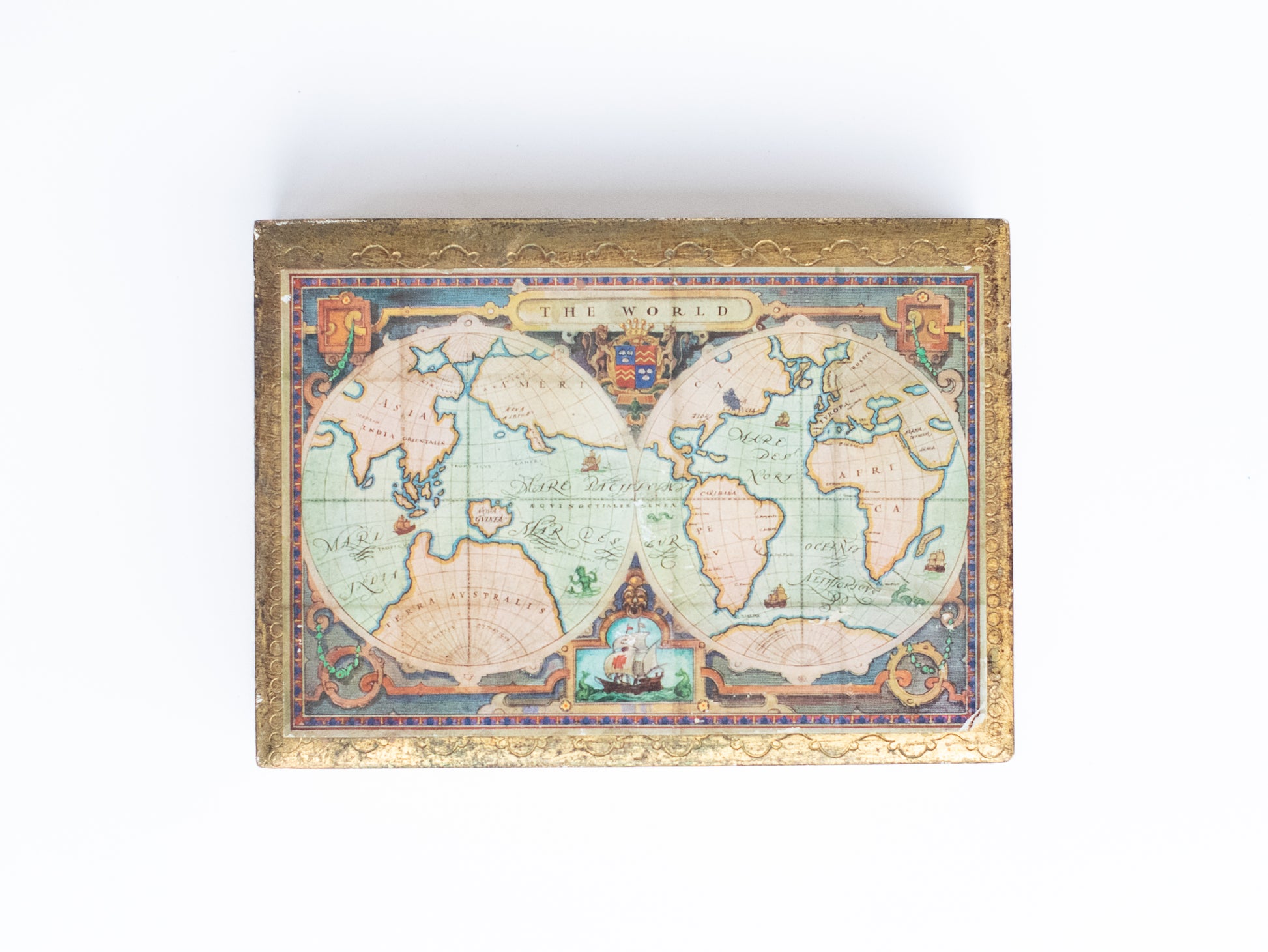 Gold leaf antique box with original map detail with purple felt interior. Perfect for finishing a stack of books and/or holding your apple tv remote.