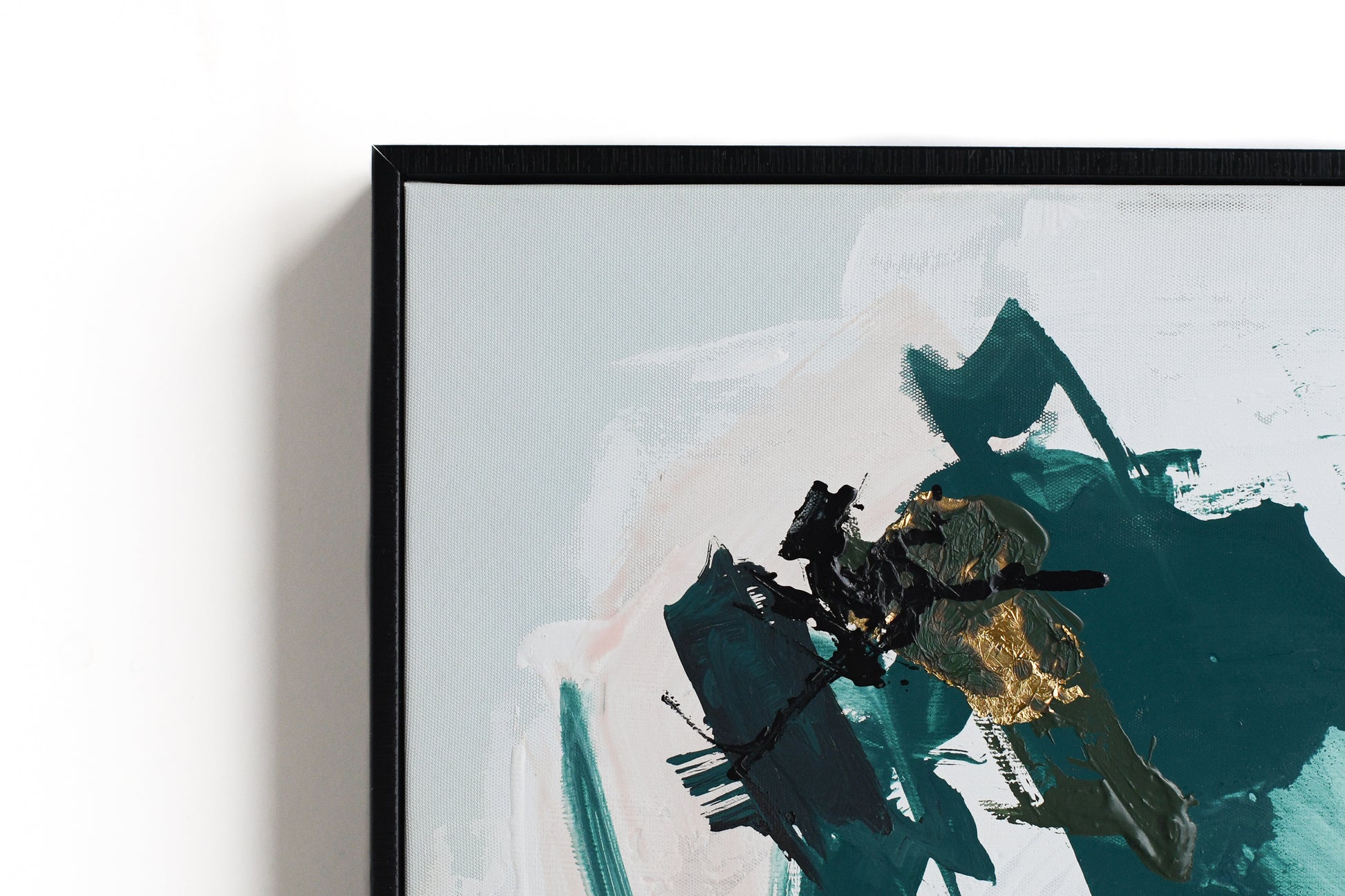 Great piece to add interest with a little edge and pop of the unexpected to a space. Containing beautiful shades of teal, gold, blush and black with a custom floating frame.
