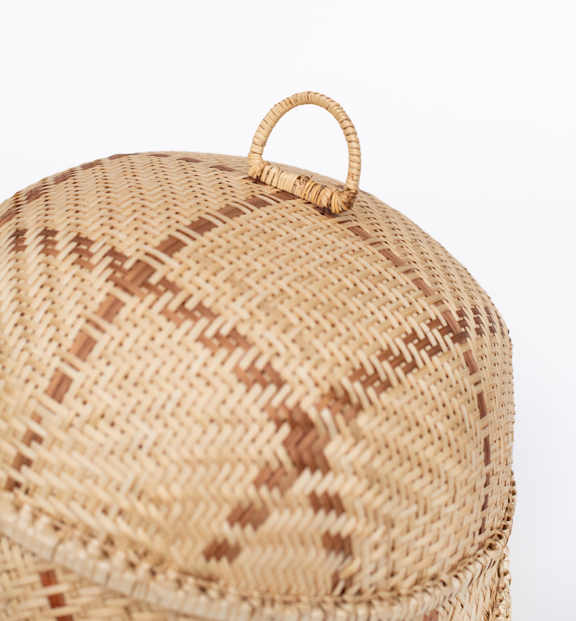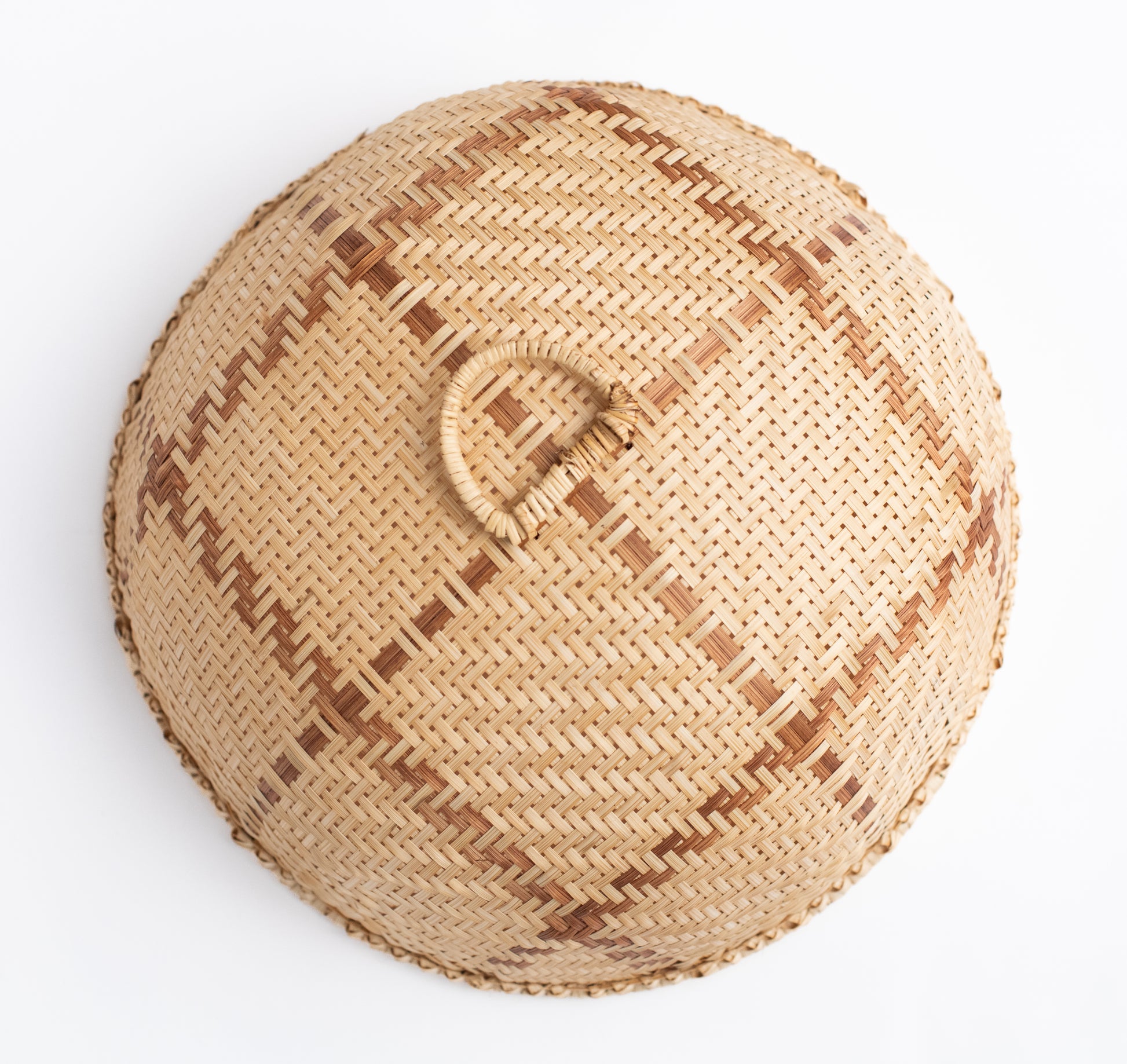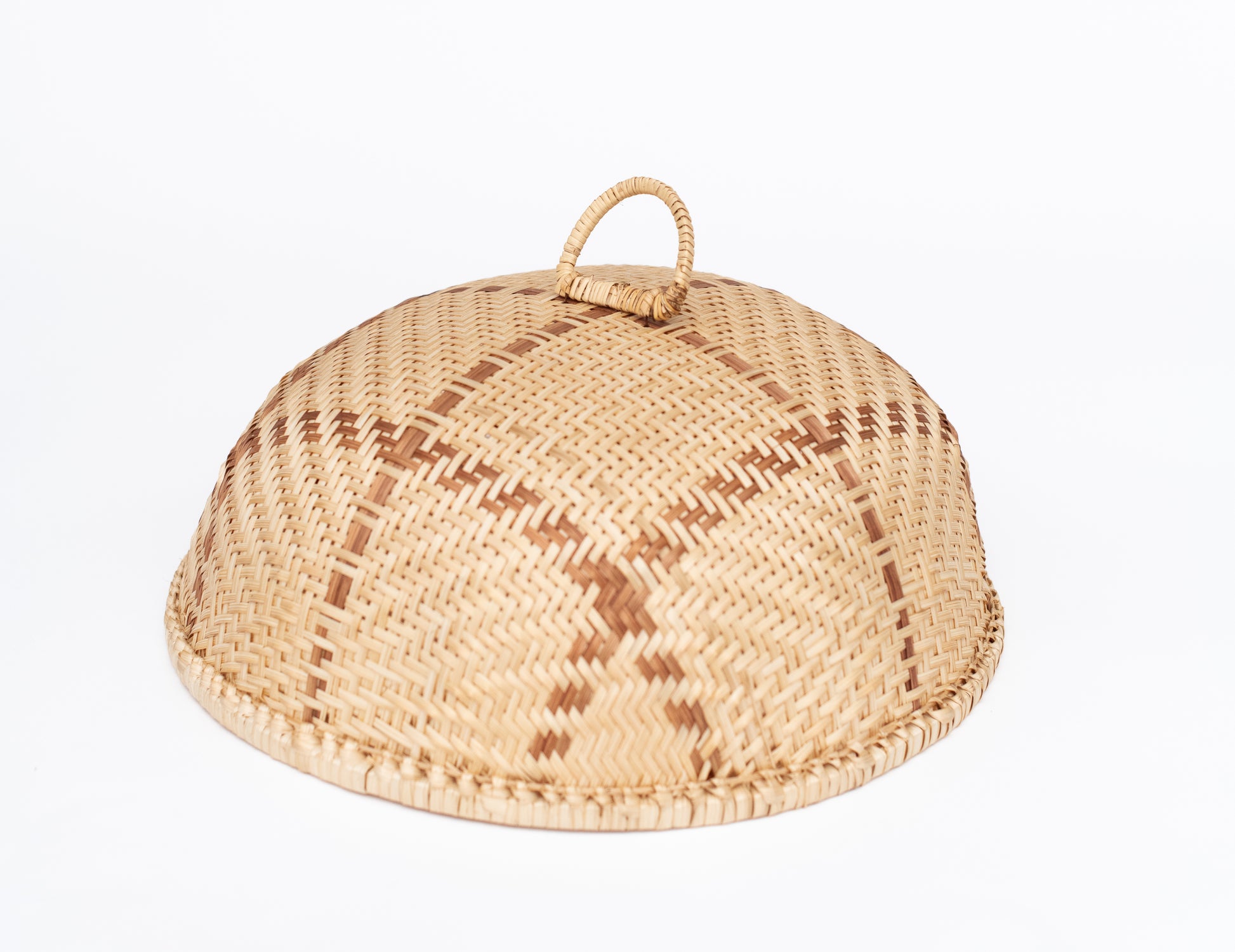 This hand-woven bamboo food cover is both functional and beautiful. It Keeps food safe and clean while showcasing a two-toned pattern that adds interest to your table or food line.
