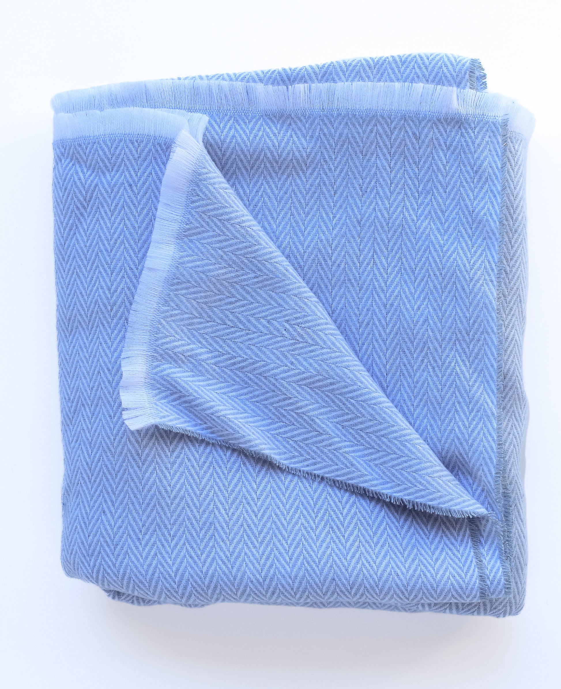 German made of recycled cotton, acrylic, and polyester, the sky blue + white herringbone throw blanket is the perfect light throw accent for added color and pattern.