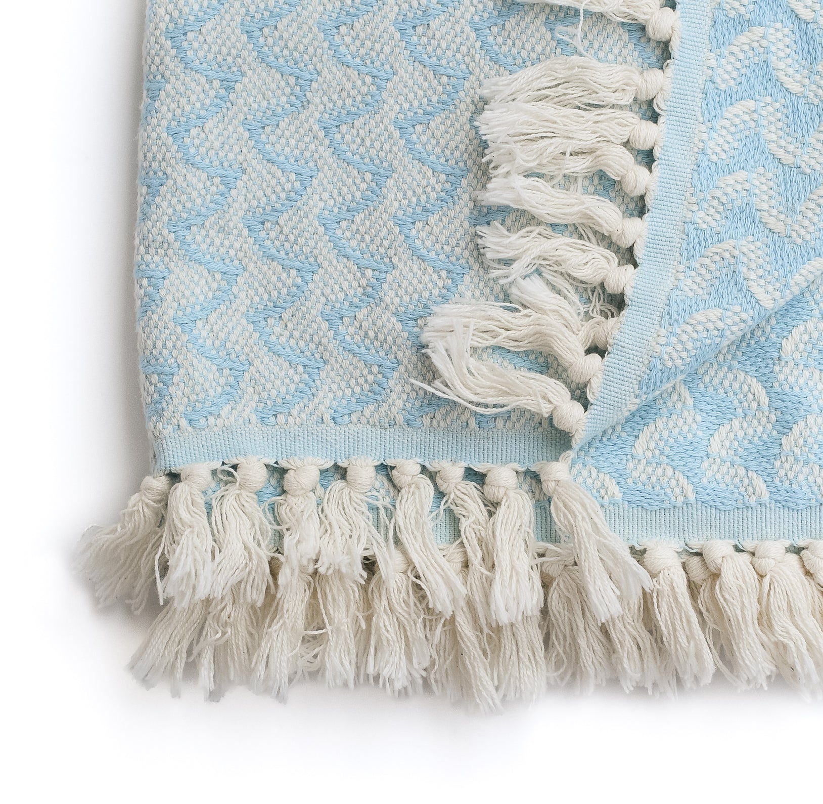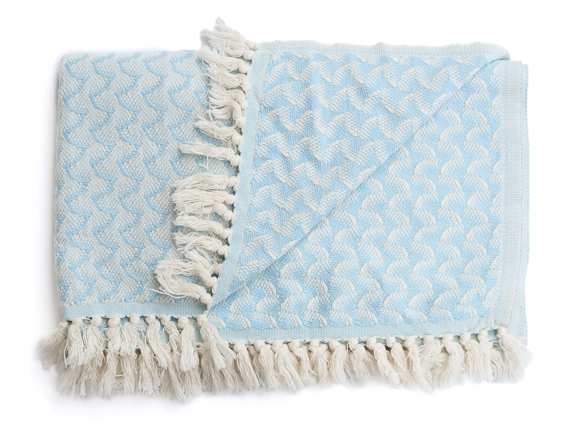 The 100% cotton Turkish throw displays an off-white + blue wave pattern which adds color to your space.