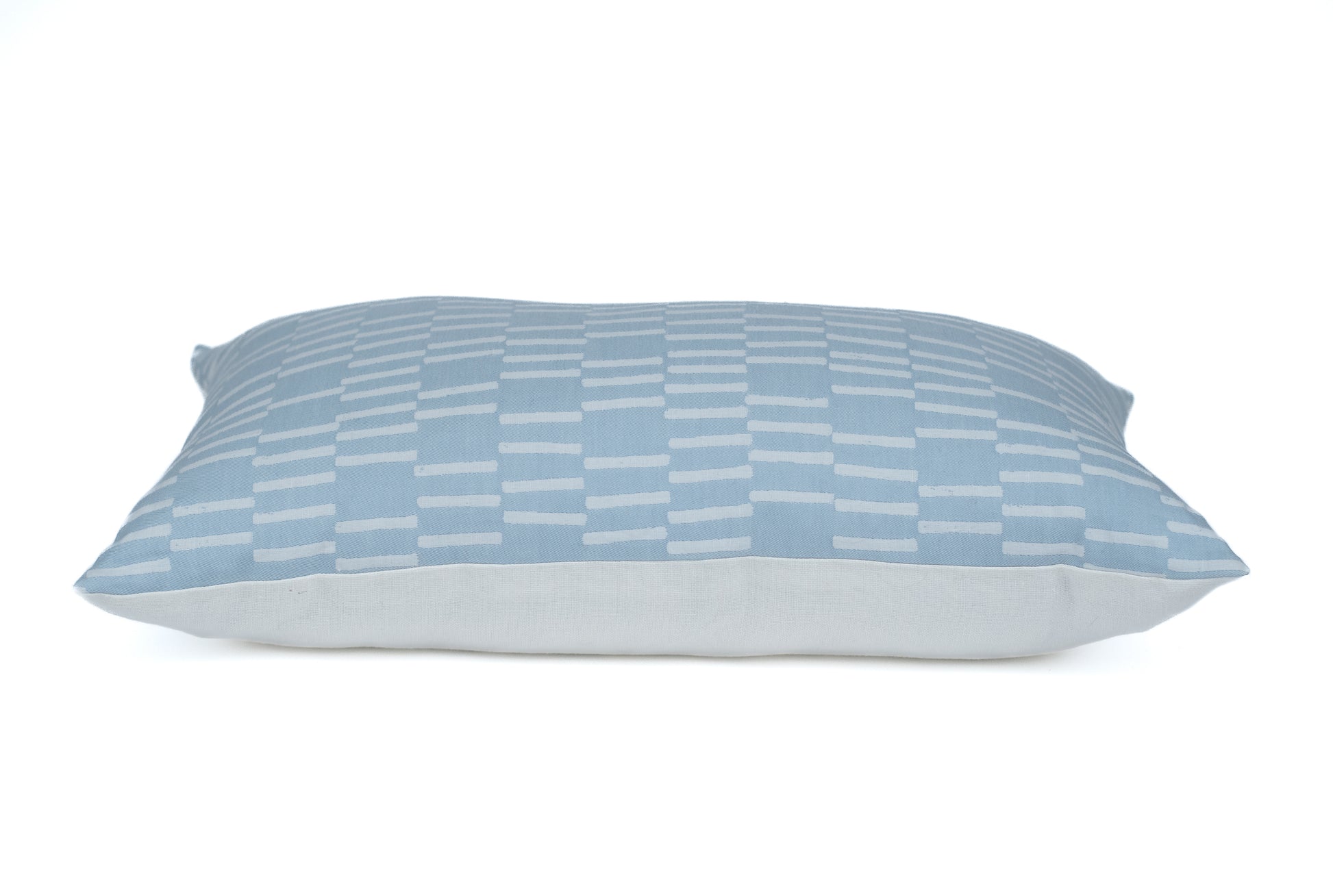 A timeless color palette of pale blue twill and white linen, our Laguna lumbar adds a soft accent to any space. This pillow pairs easily with velvets, solid linens and florals. Designed by Perch Interiors and handmade by a local artisan with a hidden zipper.