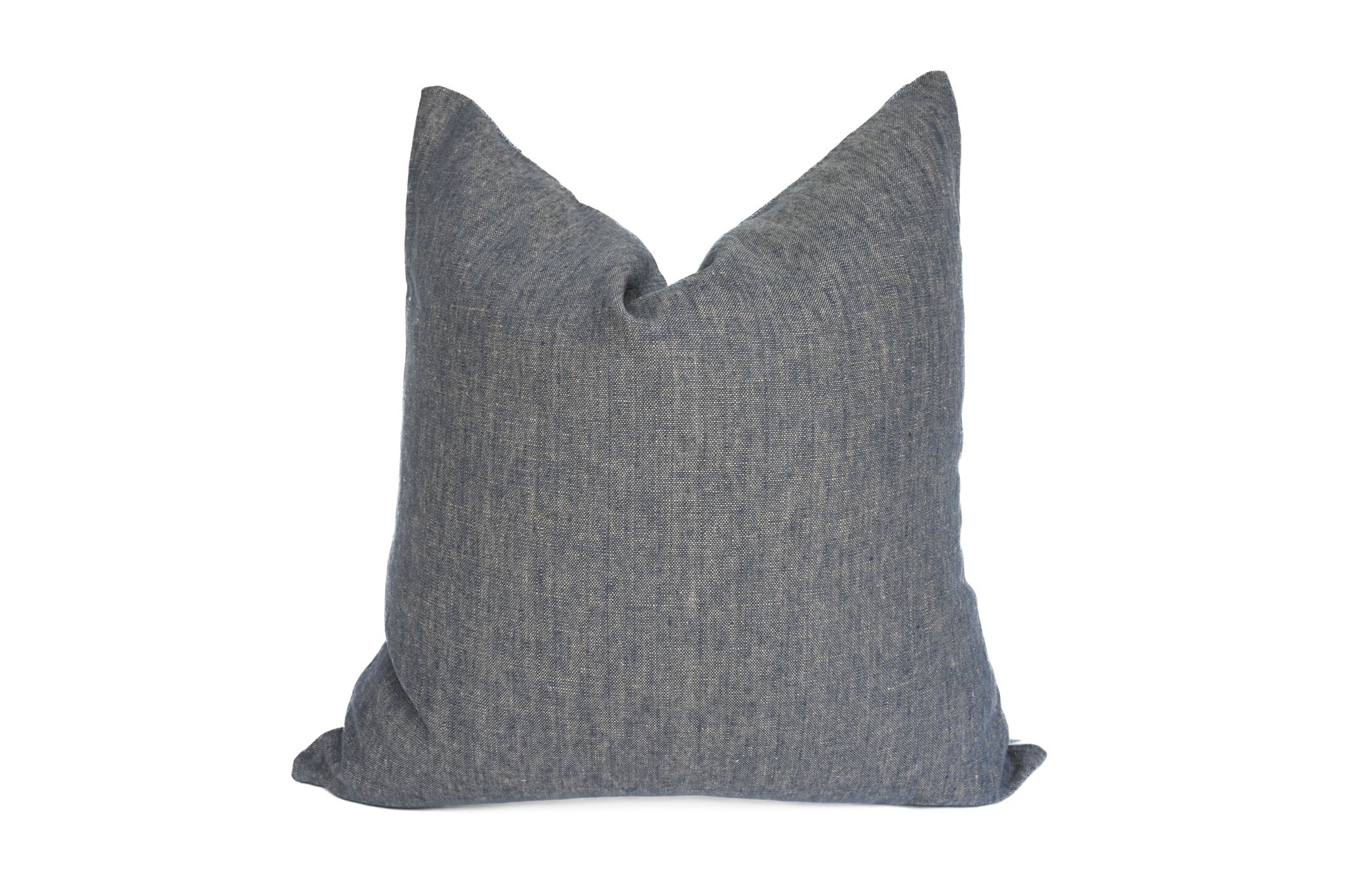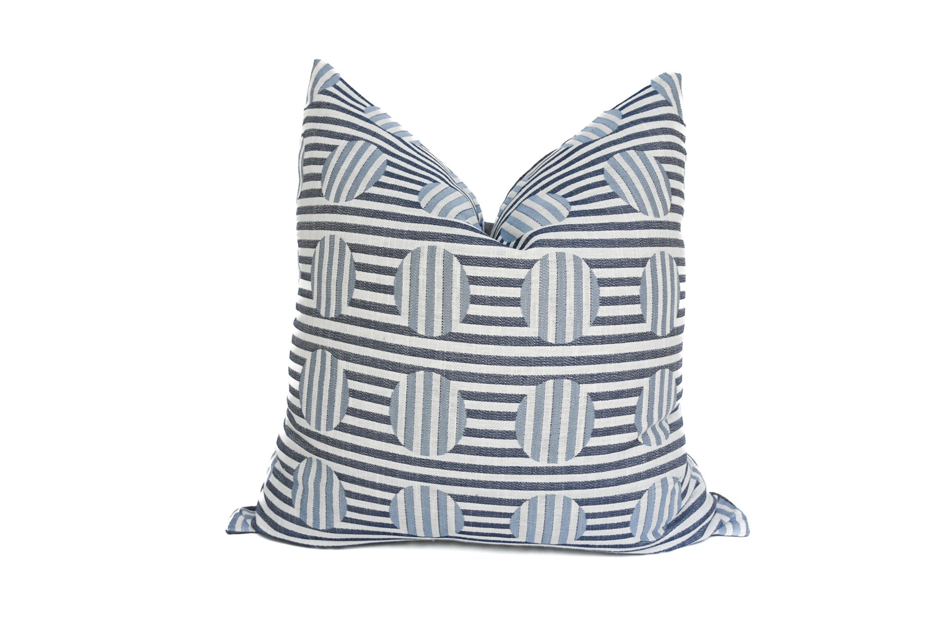 Make a modern statement with this eye-catching pillow cover, featuring bold geometric circles and contrasting stripes in soft denim blues and off white. The crisp, symmetrical pattern adds a fresh, contemporary touch, while the textured woven fabric offers a cozy, artisan feel. Finished with a rich indigo chambray backing, it's the perfect accent to elevate your living space with both style and substance.