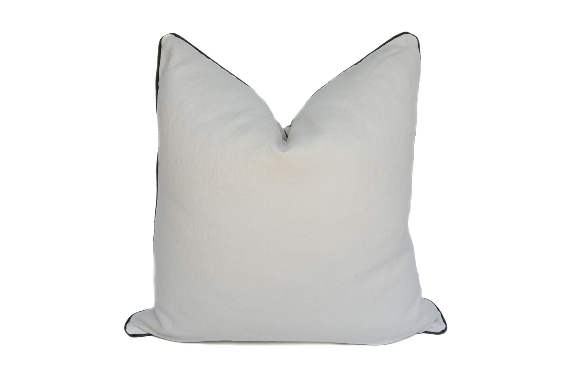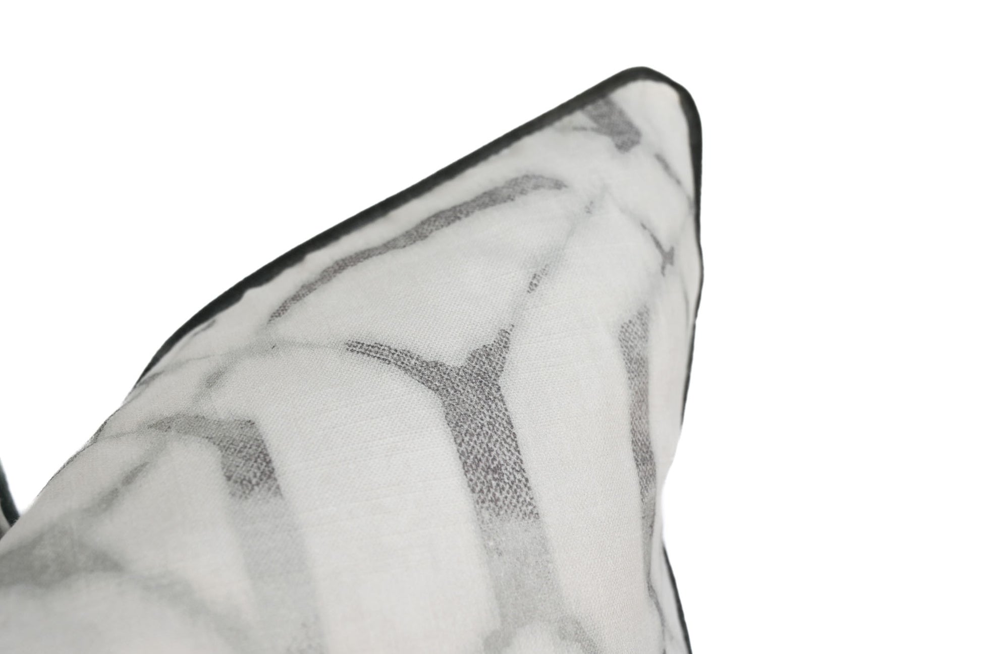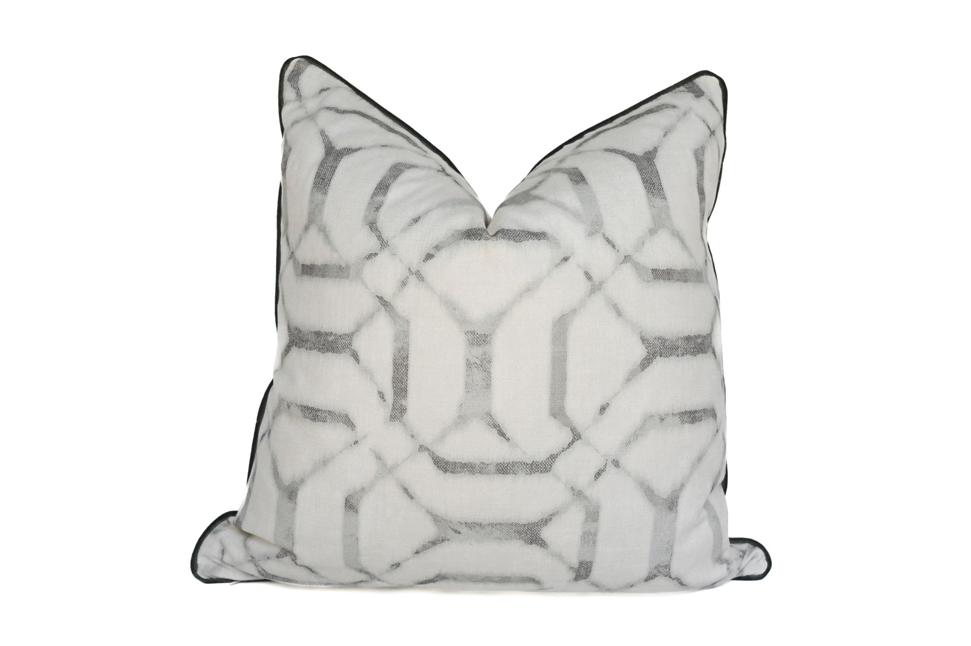 Elevate your decor with this sophisticated pillow cover, featuring a modern geometric print in soft charcoal and pale blue tones on a creamy white background. The subtle, watercolor-like texture adds depth and elegance, while the solid reverse side and piped edges offer a clean, tailored finish. Perfect for contemporary or transitional spaces, it’s a stylish way to refresh your living room or bedroom.