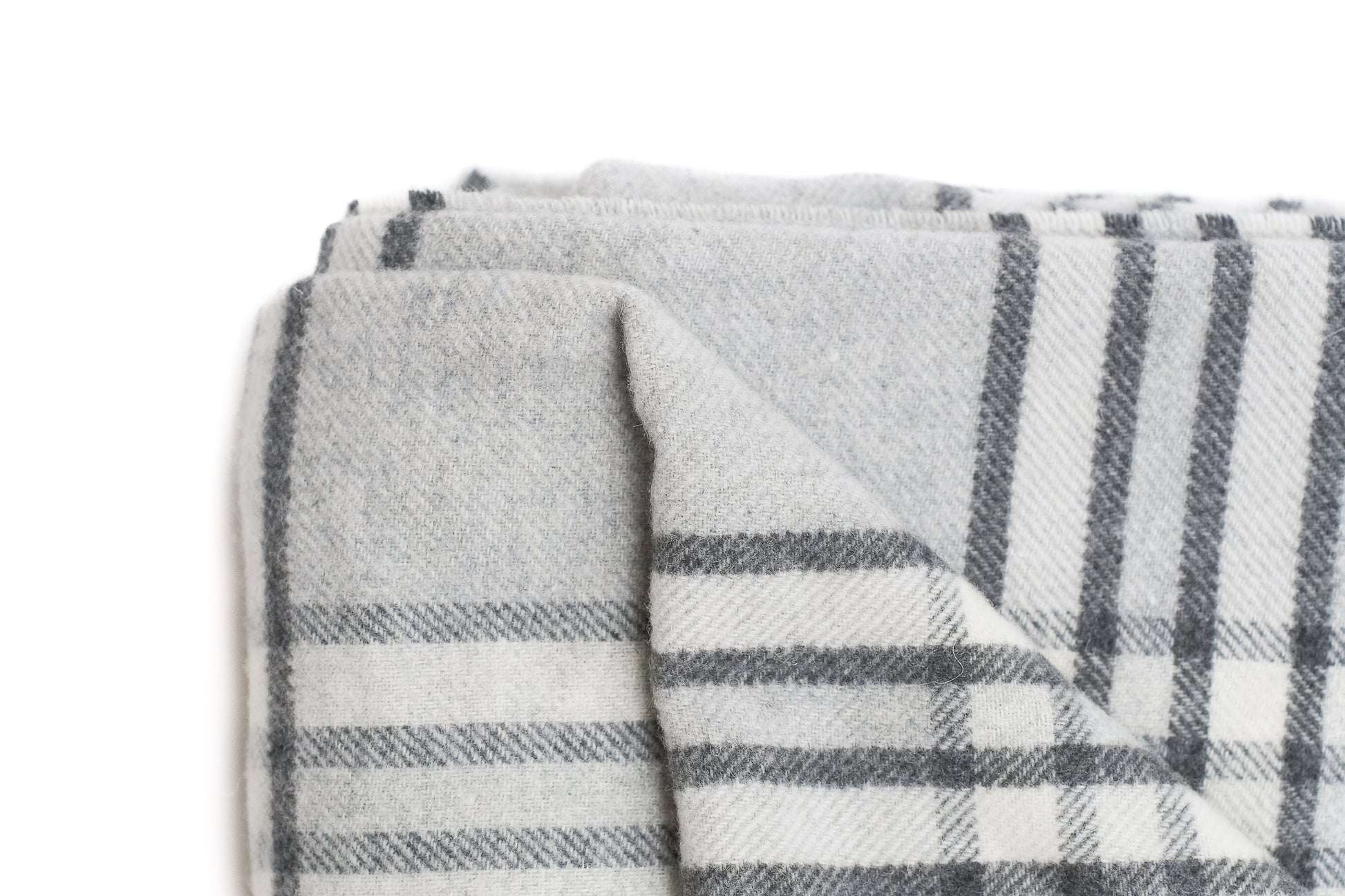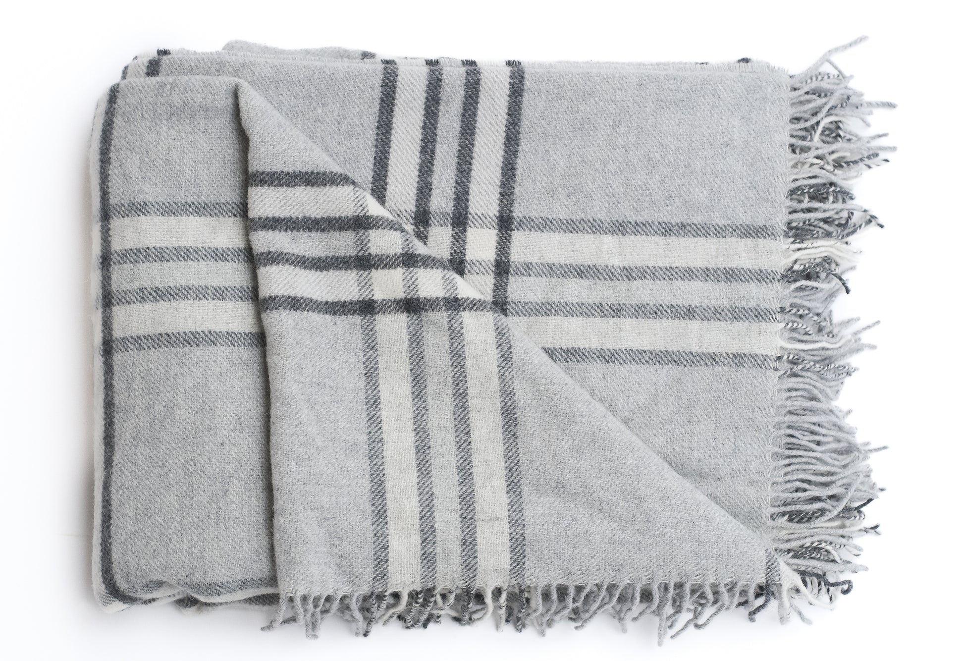 Over 50% wool, this light and dark gray plaid fringe throw adds sophistication + depth.