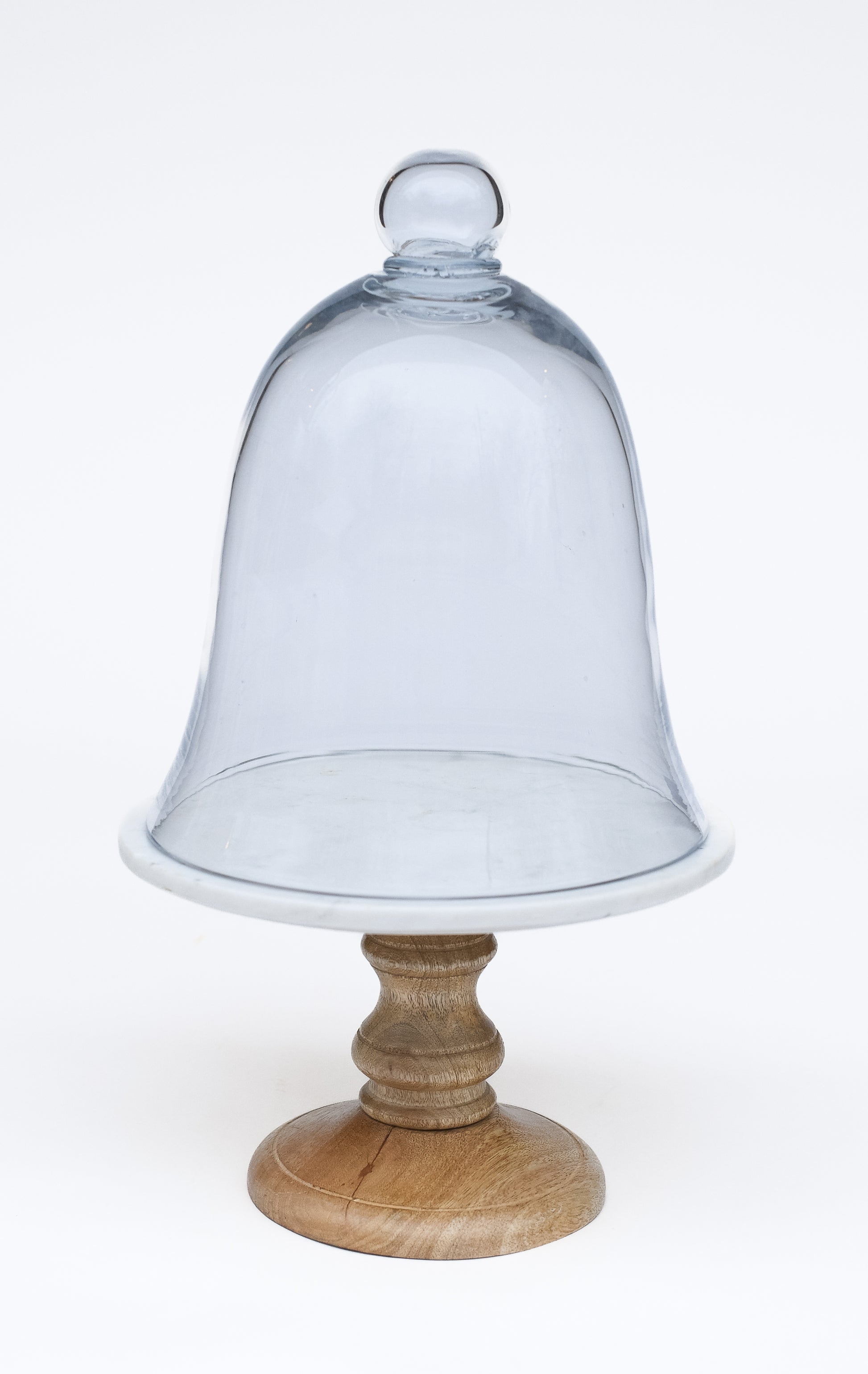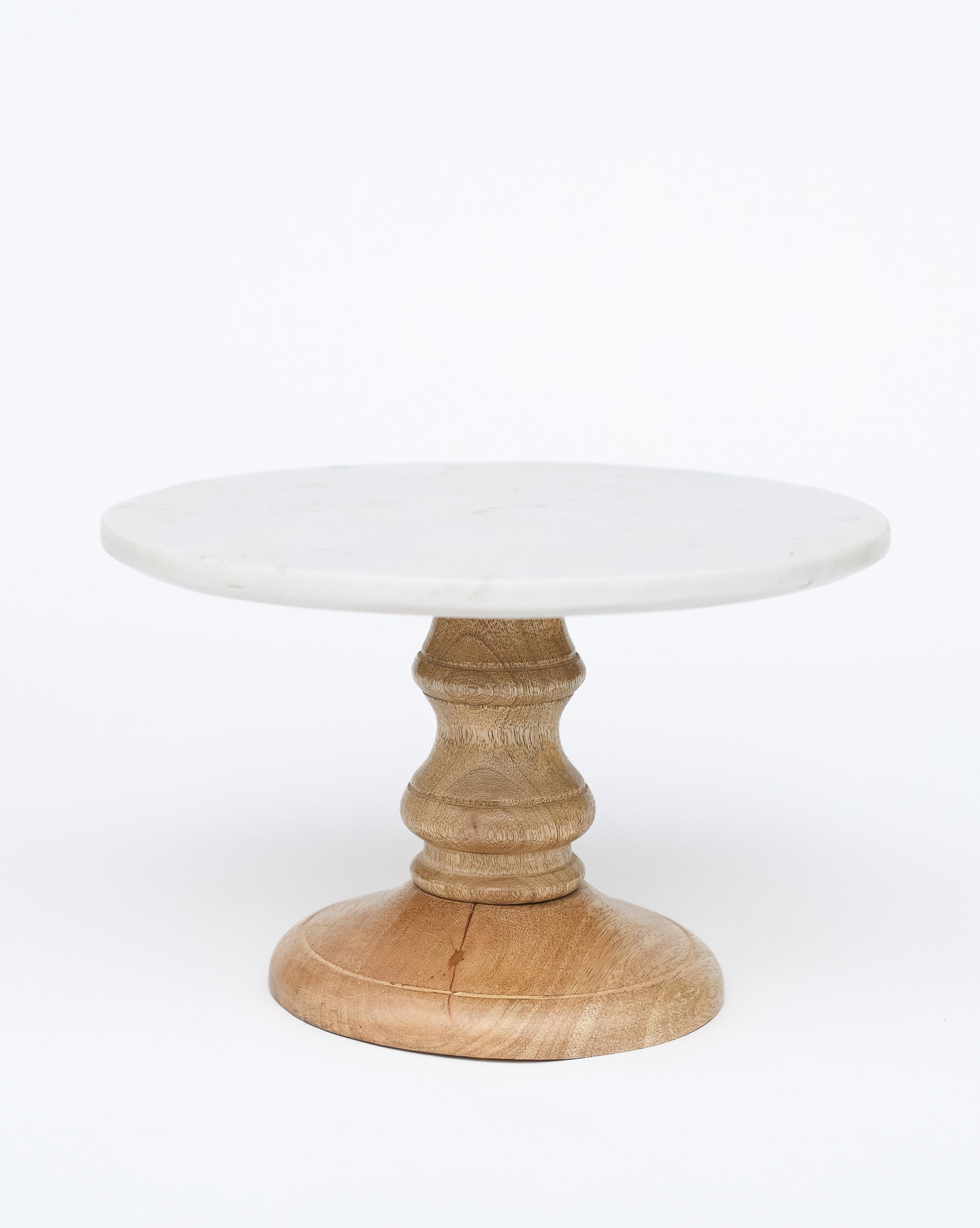 Serve your guests delicious treats with this round cake stand. The top of the stand features smooth white marble that makes all dessert look appetizing. The plate sits on a sturdy natural mango wood stand. Add this stand for an elevated look on your shelf, island, or table! *Glass cloche sold separately
